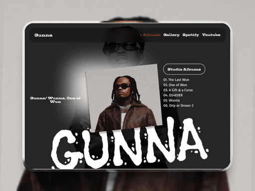 The design uses a dark, high-contrast layout paired with expressive typography to reflect the artist’s tone and presence. Album information and navigation are clearly segmented, allowing users to explore music, galleries, and streaming platforms with ease. Visual layering and hierarchy were used to keep the experience engaging while maintaining clarity.