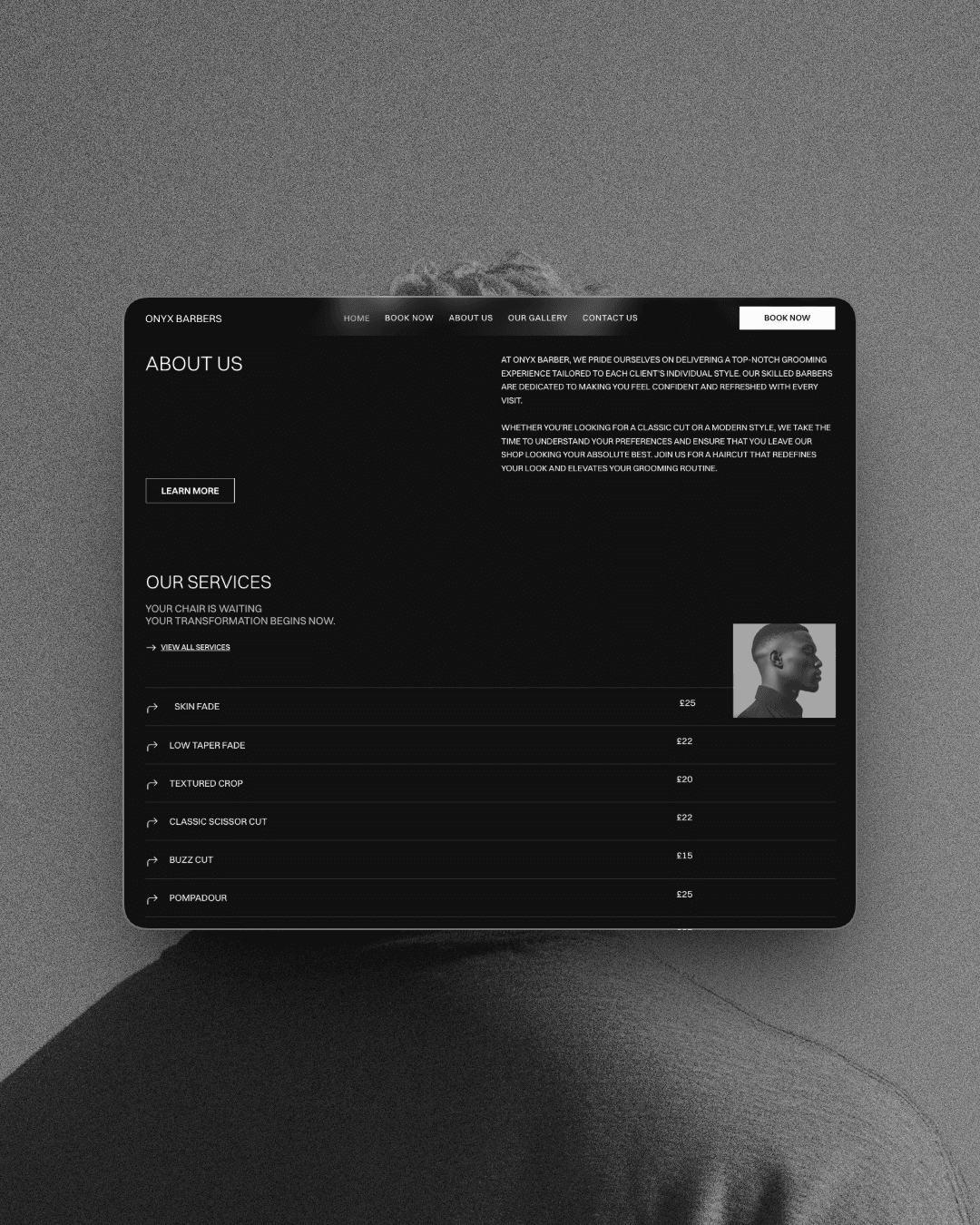 Designed with a dark, editorial aesthetic, ONYX BARBERS puts your brand's atmosphere first while guiding visitors through a seamless booking experience. From the homepage to the services menu, every section is structured to build credibility, showcase your team, and convert visitors into booked clients.